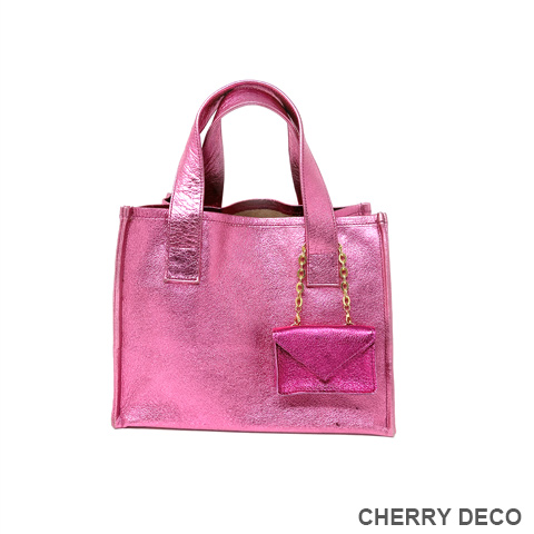 ♪CherryDeco Luxe オリジナル、アクセサリー感覚で持つメタリック箔のカラフルトート♪ 便利でかわいい封筒型チャーム付 本革高級スエードにオリジナル加工した箔メタリック生地 ちょっとだけ大人不良テイストなメタリックも、本革ベースだから上品なテイストに。 コーディネートのアクセントとして、アクセサリー感覚で気軽に持てます。 <こだわりポイント> ・日本の職人さんが、豚スエードにメタリック箔加工した生地・革づくりから手作りしたオリジナル商品 (全ての行程を国内で行なっています) ・ベースが高級スエードなので、軽くて柔らかい。クタッと馴染む高級感ある素材感 (ぜひお手にとって触っていただきたいぐらいです) ・取り外し可能な、しっかりめの底中敷で安定感とキレイな形を表現 ・幅広デザインで収納力は抜群。中身も取り出しやすいです。 ・パンチの効いたメタリックですが、柔らかな素材感が上品なマット感でラグジュアリーさを演出 ・大量生産ではない、少量だが上質へのこだわり(再販が難しい又は少しお時間がかかります) ・Cherry Deco Luxe made in Japan のオリジナルタグ付き ・デザインはシンプル。生地のオシャレ感を楽しんでいただけるよう金具は使いませんでした。 ・一つ一つが職人さんの手作り。made in Japan日本製です。 ・これだけのこだわり要素がありながら、職人さんにも最大限にご協力いただき、できる限りコストを抑えてこのお値段を実現させました。 ・流行に左右されず、長くお楽しみいただけるよう、デザイン・色・質にこだわりました (内側には自然のもの特有の色むら・傷などがございますので予めご了承くださいませ。) ・お色はブルー・グリーン・ガンメタリック・ピンク・オレンジ・パープル・ターコイズ・ブラック・レッド・ゴールド・ペパーミント・ベビーピンク・ネイビー・シルバー・ピーチ・カーキロイヤルブルー・レインボーの18色 色:ピンク・オレンジ・紫/付属チャーム紫→silver・ピンク&オレンジ→gold 大きさ:横25cm×縦21cm×幅15cm/付属チャーム横9cm×縦6cm×幅2cm 素材:豚スエード(メタリック箔加工) 生産国:日本 ※皮革は湿気を嫌い、濡れるとムラができたりすることがあります。 ※汗や水。摩擦により色落ちや色移りが生じる場合がございます。 ※ベンジン類のご使用はお避け下さい。 ※撮影環境などにより、多少実物とお色味が違って見える場合がございます。 ※素材の性質上、表面に細かい班やキズが見られる場合や、色むらや質感等の個体差がございます。 ※箔加工の過程で、場合により特有の匂いのする場合がございます。 (上記の件に関しまして、ご質問等がございましたら、お気軽にお問い合わせくださいませ。) ※なるべく無駄のないように革を使うようにしているので、特に革の裏側に傷等がある場合がございます。 ※平置き、メジャー採寸の為、表記サイズと若干の誤差がある場合がございます。 上記の件につきましてご理解・ご了承の上、お買い求めくださいませ。