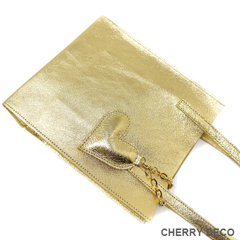 Cherry Deco Luxe コンパクトなのに収納力ありなミニトート♪日本製 かわいいプックリハート型チャーム付 本革高級スエードにオリジナル加工した箔メタリック生地 ちょっとだけ大人不良テイストなメタリックも、本革ベースだから上品なテイストに。 アクセサリー感覚で持てる、コンパクトさでコーディネートのアクセントとして気軽に持てます。 コンパクトなスッキリサイズながら、収納力抜群→長財布やペットボトルもラクラク入ります <こだわりポイント> ・日本の職人さんが豚スエードにメタリック箔加工した生地・革づくりから手作りしたオリジナル商品 ・ベースが高級スエードなので、軽くて柔らかい。クタッと馴染む高級感ある素材感 (ぜひお手にとって触っていただきたいぐらいです) ・・底中敷をつけてしっかり安定感とキレイな形を表現 ・柔らか素材なので体にフィットし、ショルダー(取手)部分も肩に馴染んで負担を軽減します ・長めのハンドルで肩かけ可能(個人差がございます) ・パンチの効いたメタリックですが、柔らかな素材感が上品なマット感でラグジュアリーさを演出 ・同じ革で作ったMトートやminicoポーチと親子で持って楽しめます。 ・貴重品を入れたご近所バッグとして、消毒グッズやサッと取り出したいものを入れて気軽に持ち歩くミニバッグとして大活躍。 ・柔らか素材なので色々な形に対応。 ・大量生産ではない、少量だが上質へのこだわり(再販が難しい又は少しお時間がかかります) ・Cherry Deco Luxe made in Japan のオリジナルタグ付き ・デザインはシンプル。生地のオシャレ感を楽しんでいただけるよう金具は使いませんでした。 ・一つ一つが職人さんの手作り。made in Japan日本製です。 ・いいものを知っている、洗練された大人の女性をイメージ。 ・これだけのこだわり要素がありながら、職人さんにも最大限にご協力いただき、できる限りコストを抑えてこのお値段を実現させました。 ・流行に左右されず、長くお楽しみいただけるよう、デザイン・色・質にこだわりました (内側には自然のもの特有の色むら・傷などがございますので予めご了承くださいませ。) ・お色は全15タイプ。メタルred・メタルpink・メタルbaby pink・メタルorange・メタルpeach・メタルgold・メタルblue・メタルpurple・メタルsilver・メタルgray・メタルnavy・メタルblack・メタルrainbow・Leopard・パイソン柄beige 色:ゴールド(メタリック箔加工) 大きさ:横18cm×幅9cm×高21cm(ショルダー立ち上がり約26cm)/付属チャーム6.5×6..5cm 素材:ピッグスエード(国産),鉄,メッキ 生産国::日本 皮革製品のお取り扱いについて注意書きタグ付き。 ※特にパイソンは、柄の出方や風合いが写真と異なります ※皮革は湿気を嫌い、濡れるとムラができたりすることがあります。 ※汗や水。摩擦により色落ちや色移りが生じる場合がございます。 ※ベンジン類のご使用はお避け下さい。 ※撮影環境などにより、多少実物とお色味が違って見える場合がございます。 ※素材の性質上、表面に細かい班やキズが見られる場合や、色むらや質感等の個体差がございます。 ※平置き、メジャー採寸の為、表記サイズと若干の誤差がある場合がございます。 上記の件につきましてご理解・ご了承の上、お買い求めくださいませ。