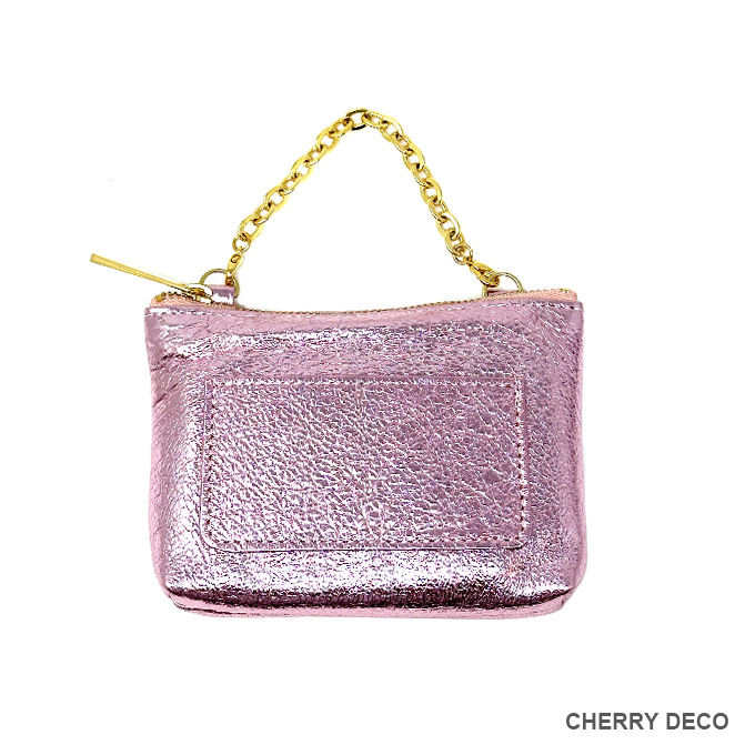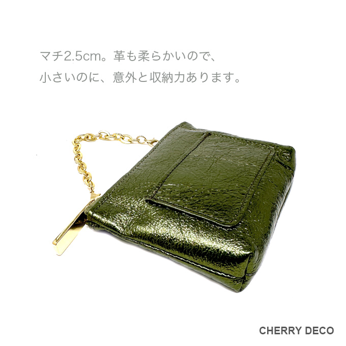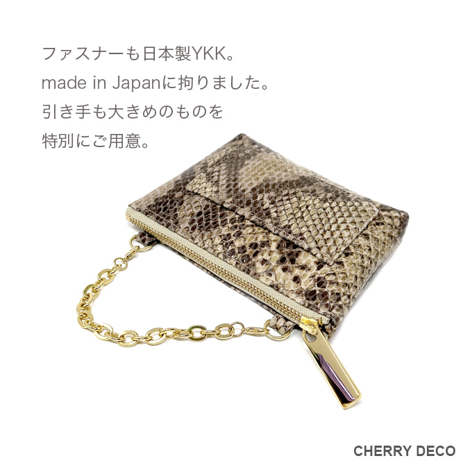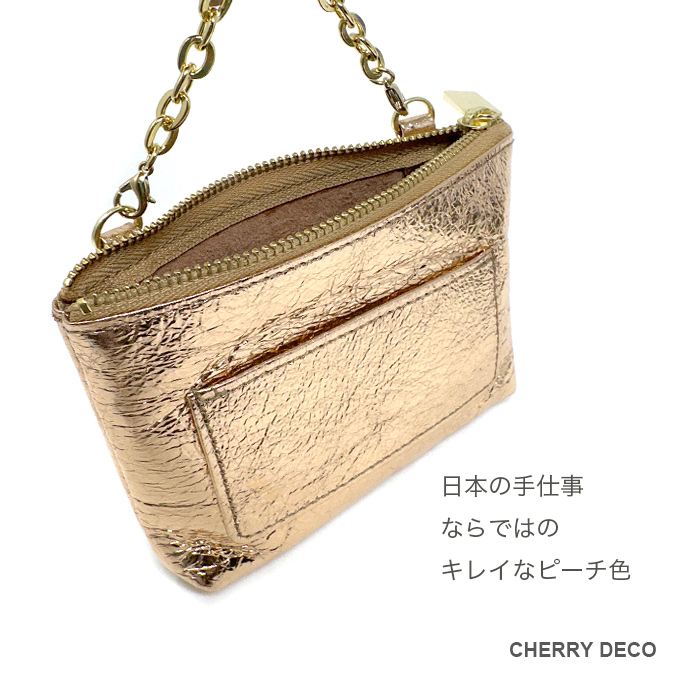 ♪Cherry Deco Luxe シリーズ♪ミニミニポーチチャーム日本製 "minico"(ミニコ)と呼んでください <こだわりポイント> ・ベースは、スエードなのにしっかり感のある高級厚口ピッグスエードを使用 ・CherryDeco Luxeの看板革を、お気軽にお試ししていただきたくて、リーズナブルな価格でご用意致しました。 ・ジッパーは、国産YKKを使用。引き手も扱いやすい、大きめサイズ(長さ約11cm)にこだわりました。 ・サッと取り出したいカギやリップ、駐車券、エコバッグなどを入れて、バッグチャームとしてお使いいただけます。 ・自然の恵みである革を、最後の最後まで使い切りたいという想いで、裏面に本革特有のシミや傷がある部分も、 敢えて使っておりますので、ご理解くださいませ。 ・バッグのアクセントとして、色々なカラーをお楽しみいただけます。 ・長いチェーン(別売り。又は、お手持ちのもの)を付けて、ミニショルダーバッグとしてもお楽しみいただけます。 ・国内産原皮から、なめし・染色・仕上げまで、すべてが国産として製造されている革で、柔らかい割に強度のある革です。 ・柔らかで上品な高級感ある素材感(ぜひお手にとって触っていただきたいぐらいです) ・大きめパーツで、色々なバッグへの付け替えも楽々。 ・大量生産ではない、少量でも上質へのこだわり。 ・Cherry Deco Luxe made in Japan のオリジナルタグ付き(内側) ・一つ一つが職人さんの手作り。made in Japan日本製です。 色:ベビーピンク,ピーチ,スミレ,カーキ,パイソン柄ベージュ 大きさ:横12cm×幅2.5cm×高9cm、チェーン約15cm 素材:ピッグスエード・メッキ(チェーン)・YKKファスナー 生産国::日本 皮革製品のお取り扱いについて注意書きタグ付き。 ※皮革は湿気を嫌い、濡れるとムラができたりすることがあります。 ※汗や水。摩擦により色落ちや色移りが生じる場合がございます。 ※ベンジン類のご使用はお避け下さい。 ※撮影環境などにより、多少実物とお色味が違って見える場合がございます。 ※素材の性質上、表面に細かい班やキズが見られる場合や、色むらや質感等の個体差がございます。 ※箔加工の過程で、場合により特有の匂いのする場合がございます。 (上記の件に関しまして、ご質問等がございましたら、お気軽にお問い合わせくださいませ。) ※なるべく無駄のないように革を使うようにしているので、特に革の裏側に傷等がある場合がございます。 ※平置き、メジャー採寸の為、表記サイズと若干の誤差がある場合がございます。 上記の件につきましてご理解・ご了承の上、お買い求めくださいませ。